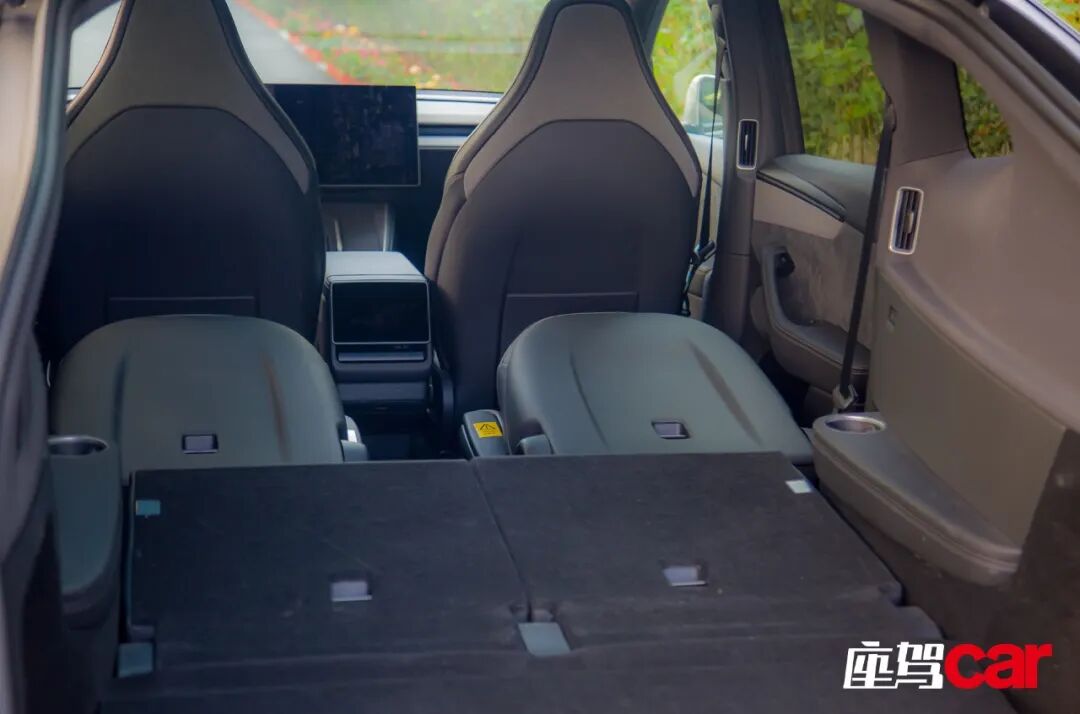 得益于超过3米的轴距,Model Y L的第三排乘坐体验也恰到好处。双座椅支持电动靠背调节与座椅加热功能,满员出行时不会给坐在这里的乘客带来困扰。在野外露营时,你甚至可以通过尾厢侧壁的组合按键轻松将二、三排座椅全部放平,使Model Y L秒变“大床房”,配合特斯拉官方提供的充气床垫及车辆新增的外放电套装,你会感叹生活本该如此。
