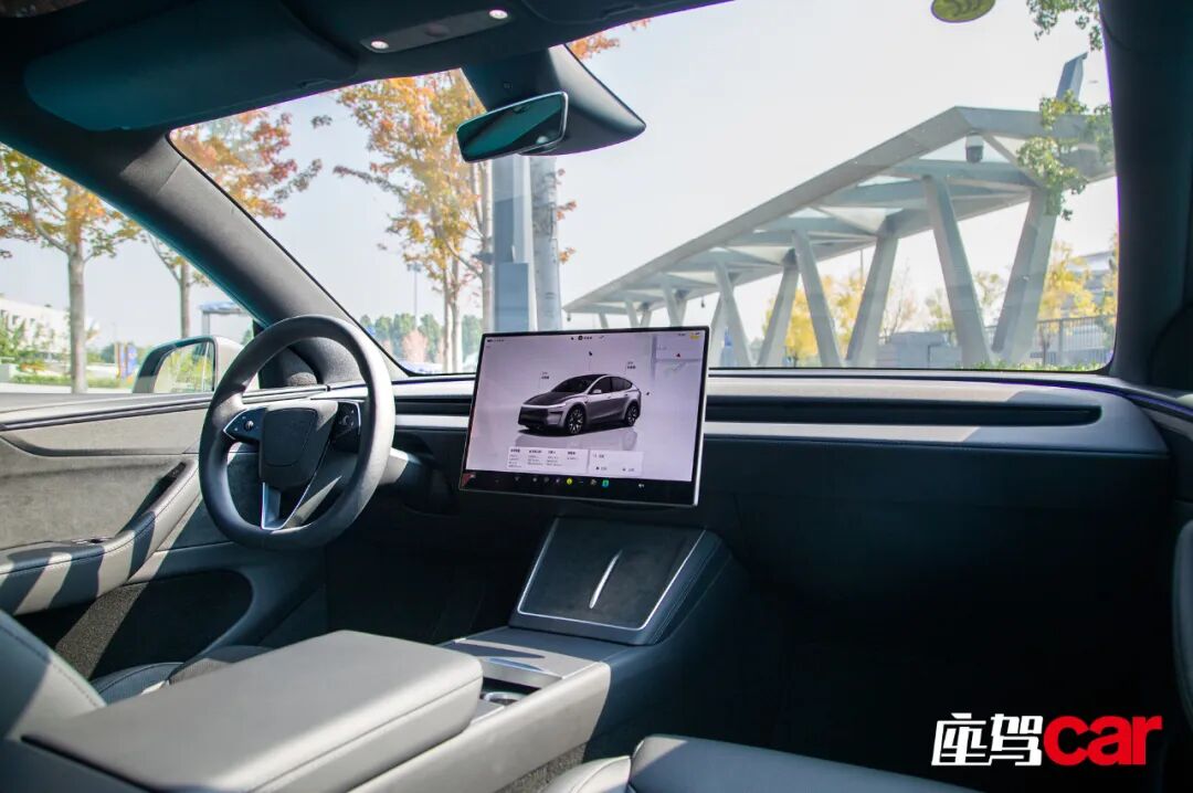 来到车内,不出所料,特斯拉并未因其大6座的身份而对内饰进行大幅度改造,而是依然保持了“毛坯房”式的一贯风格。一个方向盘,一块中控大屏,构成了驾驶员与车辆沟通的全部介质。当然,新车型(包括2025年10月之后生产的Model 3)还是听取了大家的建议,将转向灯操作进行了复原,回到了大家熟悉的拨杆形式,只不过,它依然不具备拉动闪远光的功能。大灯、雨刮器、摄像头等功能还是需要通过方向盘两侧的多功能开关操作,挡位切换也继续集成在中控大屏左侧边缘。
