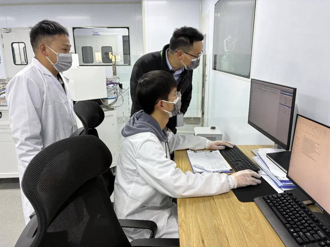 王波(右一)在分析检测中心与技术人员一起查看一批高纯度材料的检测数据。