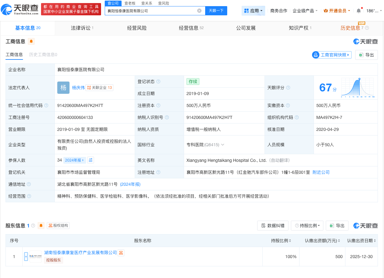 天眼查工商信息显示,襄阳恒泰康医院有限公司成立于2019年1月,法定代表人为杨庆伟,注册资本500万人民币,经营范围为精神科、预防保健科、医学检验科、医学影像科。股东信息显示,该公司由湖南恒泰康康复医疗产业发展有限公司全资持股。值得注意的是,爱尔眼科创始人陈邦为该公司实际控制人。变更记录显示,去年7月,该公司曾变更财务负责人。