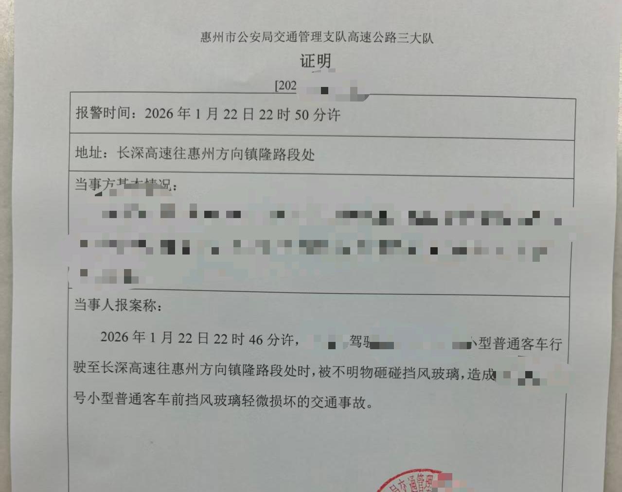 其实整个过程挺有戏剧性的。事情发生在2026年1月22日晚上快11点,朱先生开着他的客车在长深高速往惠州去,在镇隆那一段,车前挡风玻璃突然被不明东西砸坏了。等交警三大队赶到现场,他们给出的事故证明都写了“前挡风玻璃轻微损坏”,也算是官方认定的交通意外。之后给4S店一查才知道,要修好得花好多钱。惠盐高速公路那里,朱先生一开始要求赔付全部损失,但路政大队立马强调都是按保险的“惯例”来,一般也就是一半,这次顶多赔七成。