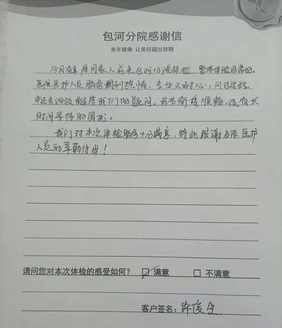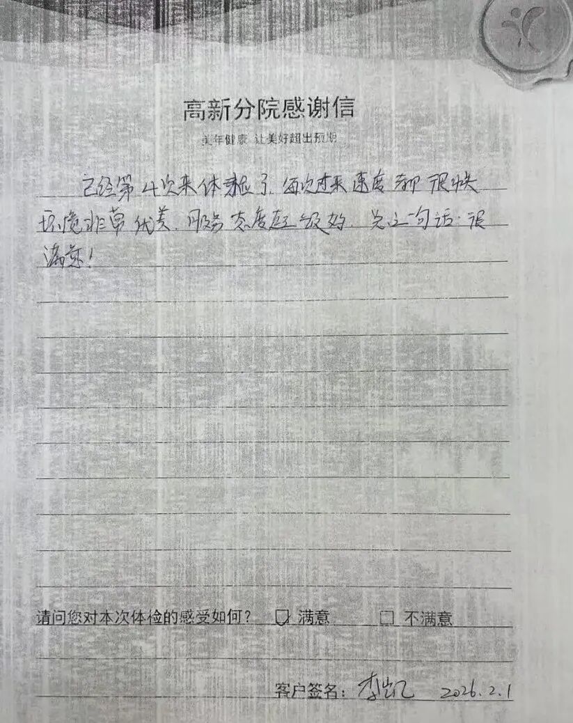 “今日有幸陪同家人前来包河分院体检,整体体验非常好。医院医护人员服务热情,专业又耐心,问诊过程中还会细致解答我们的疑问。环节衔接顺畅,没有长时间等待的困扰。我们对本次体检服务十分满意,特此感谢全体医护人员的辛勤付出!”