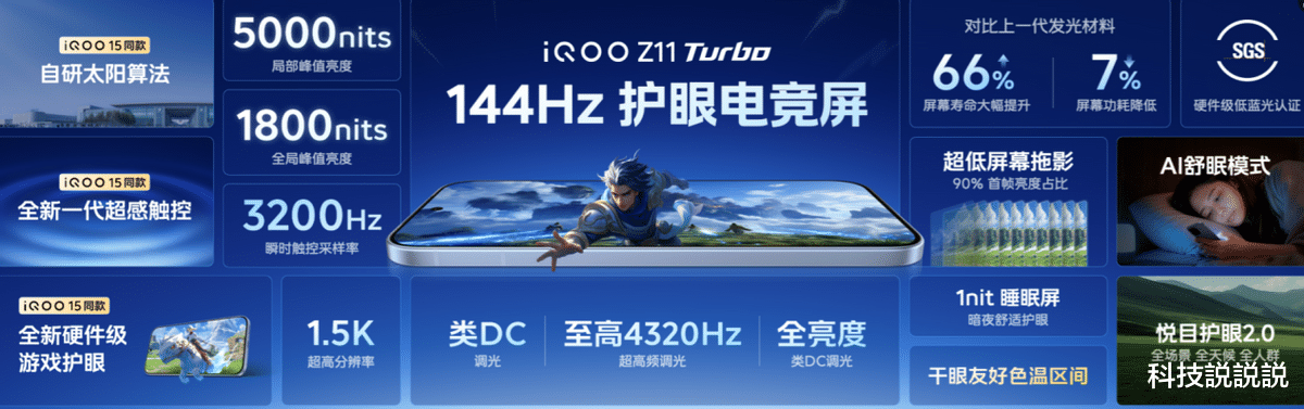 iQOO Z11 Turbo配备6.59英寸1.5K 144Hz护眼电竞屏,支持类DC调光、至高4320Hz超高频调光、全亮度类DC调光三重护眼方案,通过SGS硬件级低蓝光与低频闪认证,实现全天候、全人群、全场景护眼。