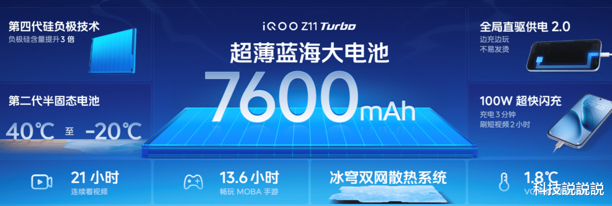 iQOO Z11 Turbo内置7600mAh超薄蓝海大电池,采用行业领先的第四代硅负极技术,能量密度达iQOO全系最高的860Wh/L,续航能力远超同尺寸性能机。配合100W超快闪充与全局直驱供电2.0技术,边玩边充不发烫、不伤电池,一杯咖啡的时间即可回血过半。