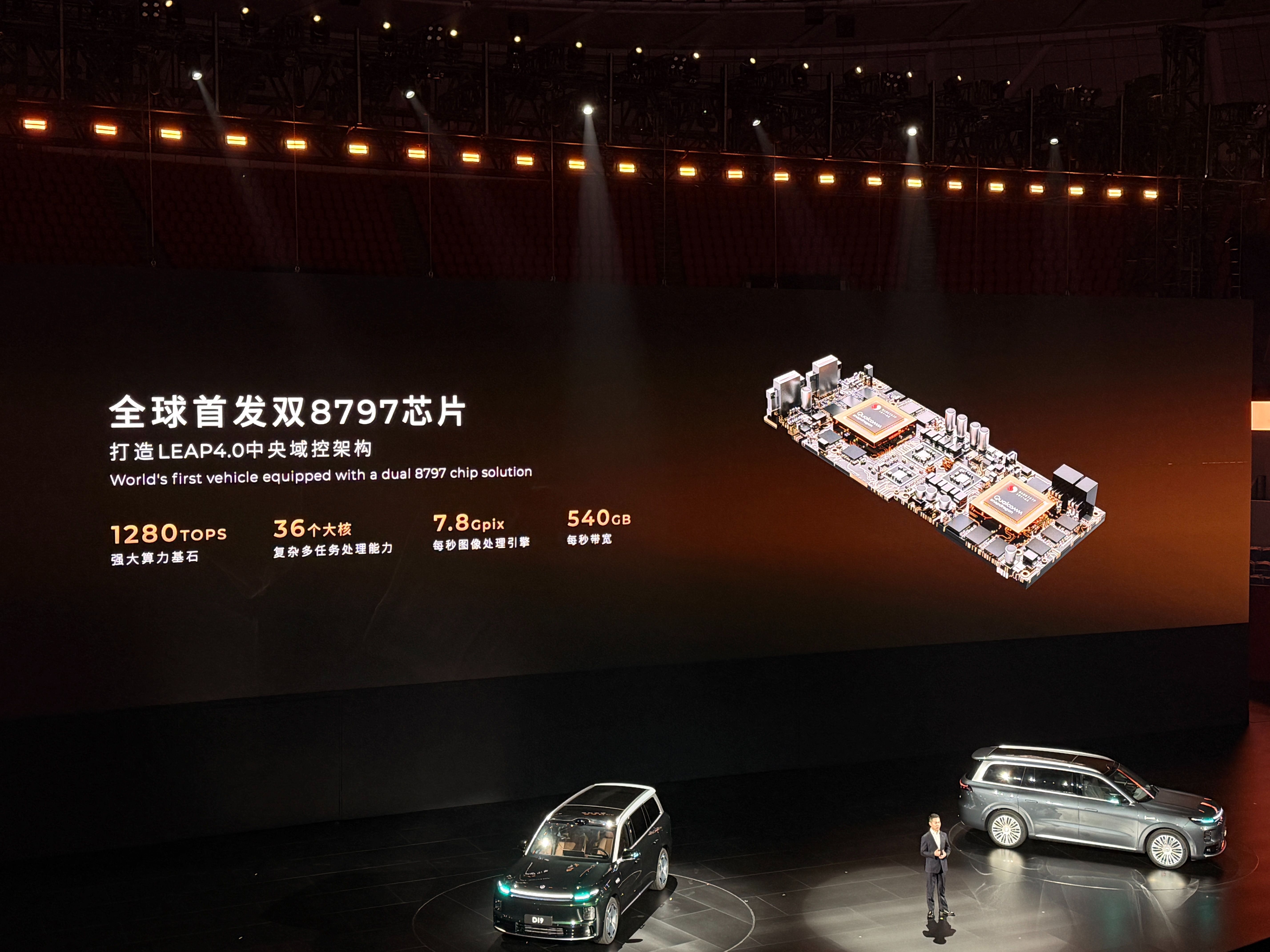 车内多屏联动,包括60英寸的AR-HUD、10.25英寸仪表屏、17.3英寸中控屏,后排配备有21.4英寸3K娱乐屏和6英寸的后排控制屏,零跑D19搭载LEAP4.0中央域控架构和双高通8797舱驾一体芯片,算力达到了1280TOPS,支持端侧AI大模型和五屏三维空间立体交互。