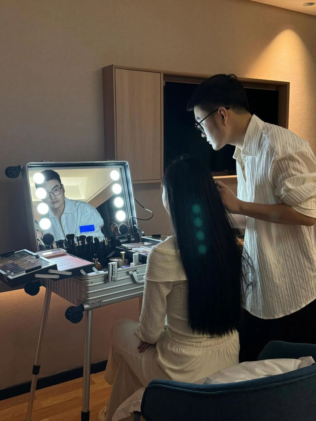 化妆镜卡在行李箱上半层,灯带在镜子底部围镜粘一圈,这样化妆不背光。