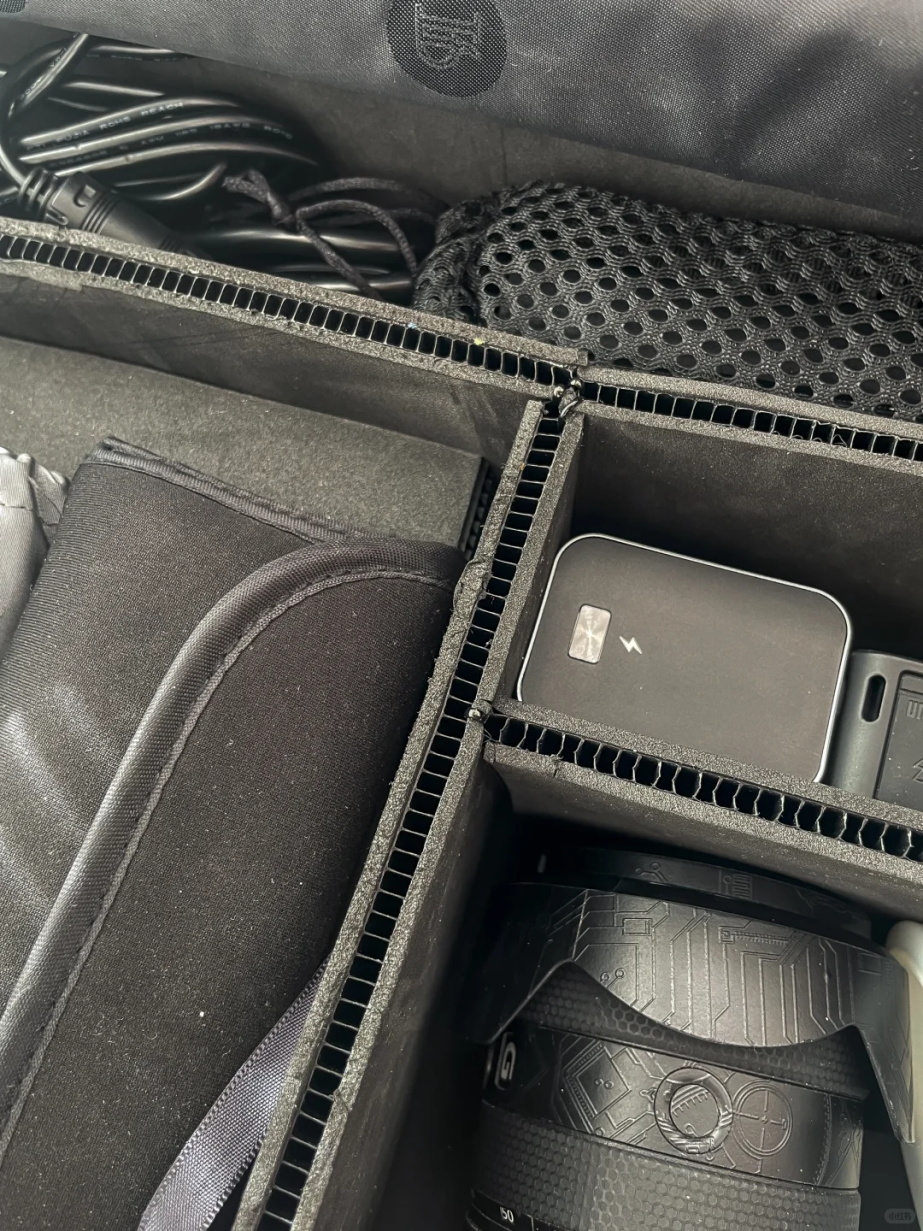 买专业摄影箱太贵,就把行李箱改装,内部用瓦楞隔板分格,铺EVA海绵防震,相机、镜头、三脚架各有专属位置,防震防刮。外出拍照直接拉着行李箱走,比专业摄影箱还实用。