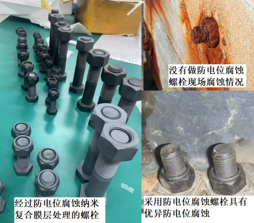 螺栓是连接金属与金属、金属与非金属之间的重要连接配件,在核电、风电、火电、轨道交通、桥梁、车辆、轮船、化工、储油设备设施中有大量连接螺栓,因为其所处的环境极为恶劣,长期浸泡在雨水或海水或干湿交替环境加速腐蚀,这类腐蚀往往是从内部往外腐蚀,虽然很多结构件表面刷重防腐油漆,但防腐涂料只能防止外部往里面腐蚀,但无法阻止内部腐蚀,大部分螺栓腐蚀都是从内部往外腐蚀,主要原因是在水环境或潮气很中的环境中,不同金属之间存在电位差(如碳钢和不锈钢之间的电位差约为0.5V),存在电位差形成“局部电池”,形成电化学反应。在孔穴、垫片接触面、搭接缝内、沉积物下、紧固件缝隙内是常发生缝隙腐蚀、小孔腐蚀,这也是为什么很多结构件,其他地方涂层都是完好,而连接螺栓处从里面往外腐蚀原因,像不锈钢、钛、铝合金等,虽然自身容易形成钝化膜抗腐蚀能力强,但因为存在电位腐蚀,通过螺栓局部小点腐蚀逐步向面腐蚀扩散,点腐蚀导致钝化膜破坏,进而延伸从钝化膜里面进行腐蚀。这种腐蚀无论在结构件表面如何刷涂重防腐涂料,是无法解决的。