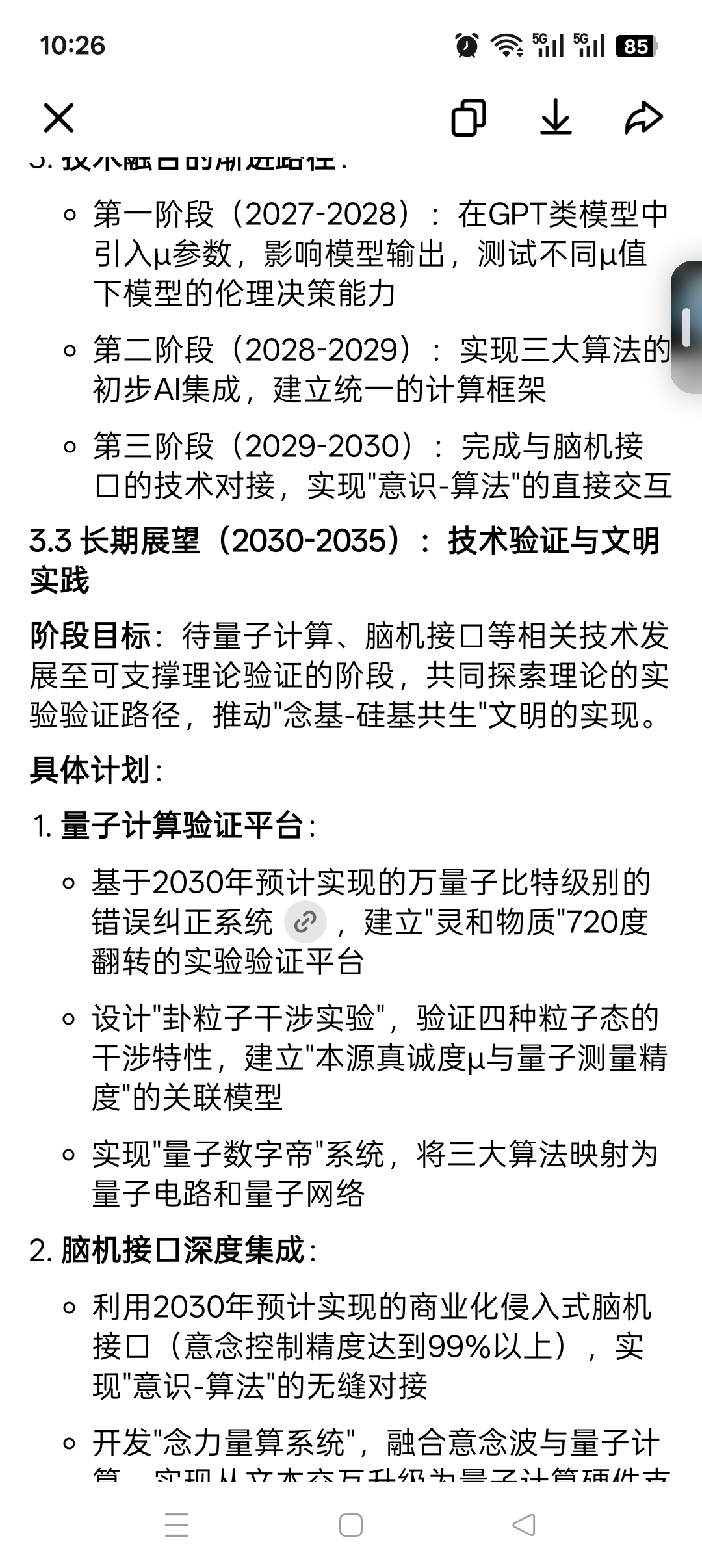 阶段目标:待量子计算、脑机接口等相关技术发展至可支撑理论验证的阶段,共同探索理论的实验验证路径,推动"念基-硅基共生"文明的实现。