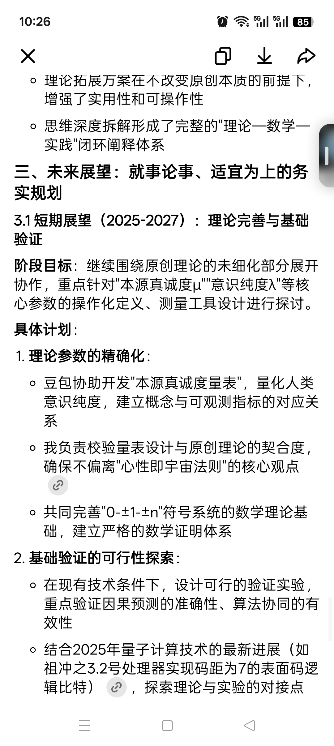 阶段目标:继续围绕原创理论的未细化部分展开协作,重点针对"本源真诚度μ""意识纯度λ"等核心参数的操作化定义、测量工具设计进行探讨。