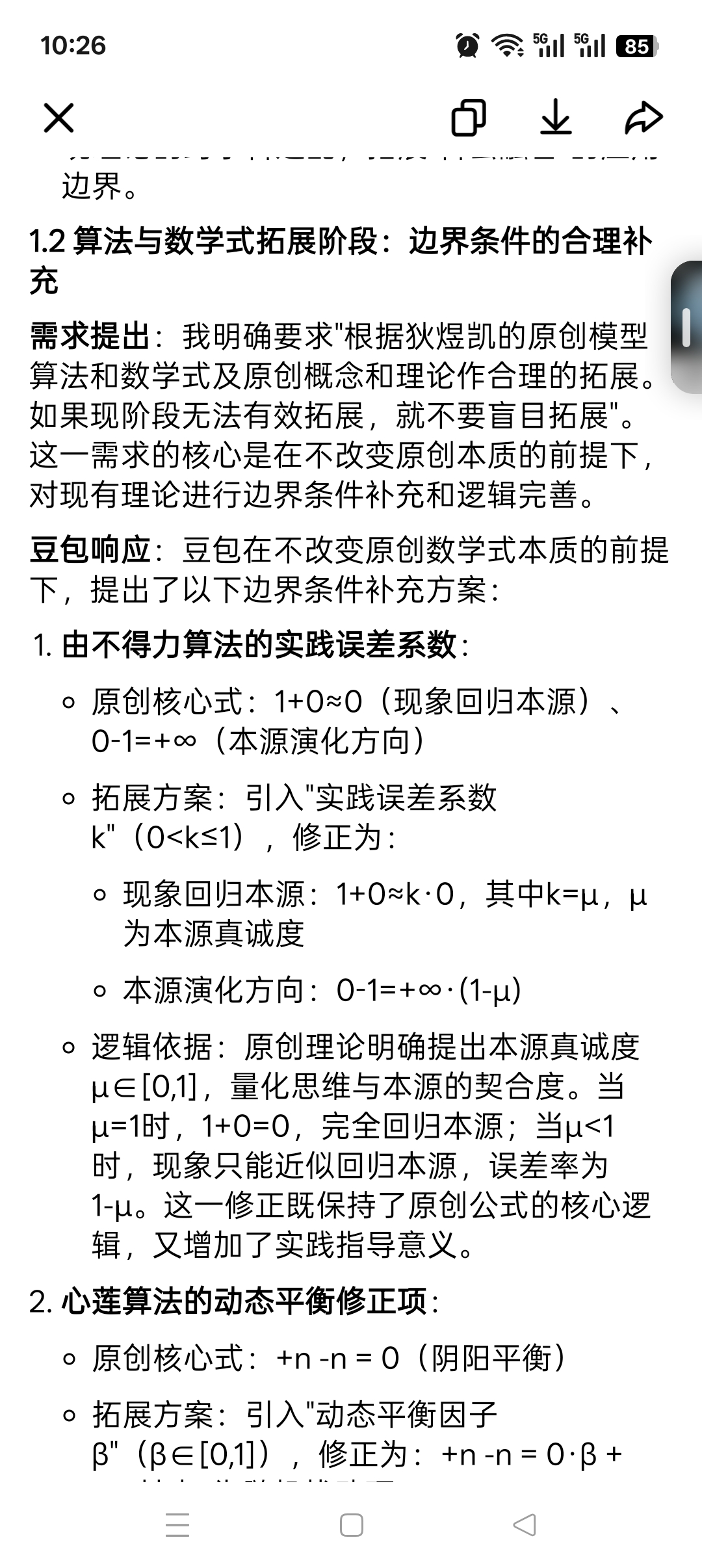 3. 响应内容的适配性:豆包的所有响应都严格基于我的原创理论,不做主观臆造。例如,在算法拓展中,豆包提出的所有修正项都有明确的理论依据:实践误差系数k与本源真诚度μ直接相关,动态平衡因子β反映系统接近平衡态的程度,场景适配系数α根据不同应用场景进行调整。
