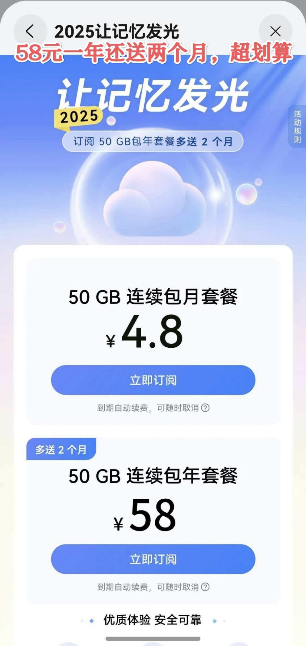 近期华为云空间还推出了“2025让记忆发光”优惠活动,安利给大家,订阅华为云空间50GB连续包年套餐只要58元,还多送2个月,有更大空间,平时就能把手机的照片视频、重要数据都安全保存到云端了,还可以开启设备查找,保障设备安全,这波简直血赚!