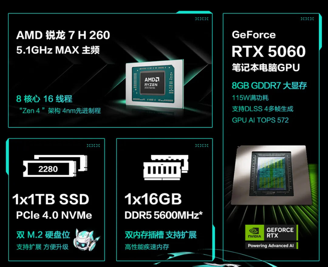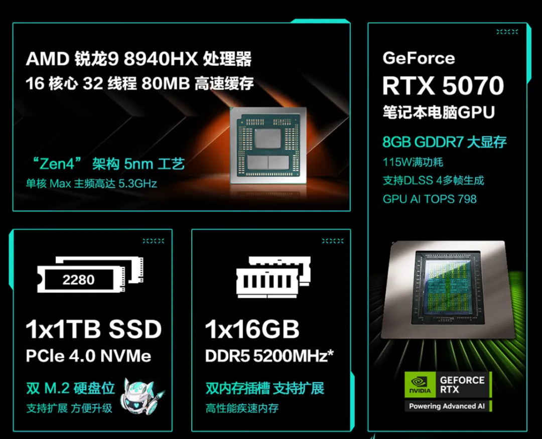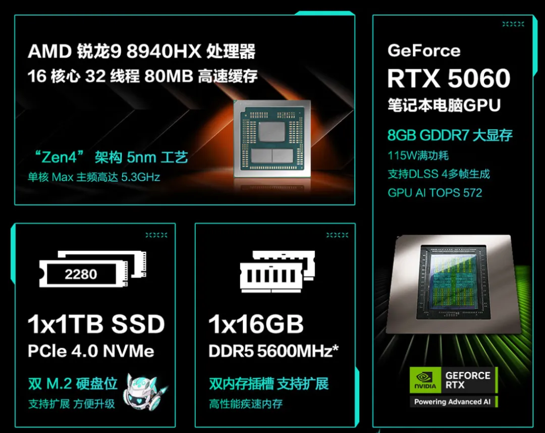 搭载多达16核心32线程的锐龙9 8940HX处理器,CPU性能在今天也依旧是准第一梯队。标配16GB内存+1TB存储组合,武装115W满功耗的RTX5060独显,在冰川散热系统的内吹技术加持下,双烤功耗释放更是可达180W,还有薄至17.9mm和2.25kg的轻盈身材,不仅无负担携带,无论是游戏还是专业创作都更加游刃有余。
