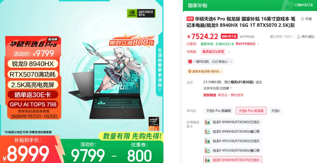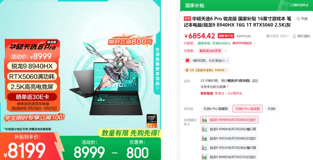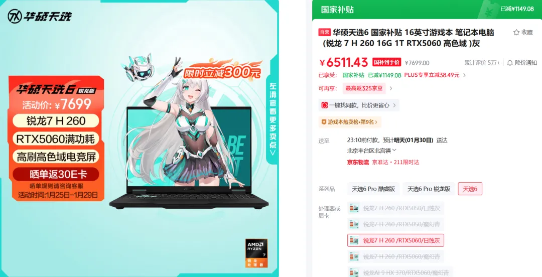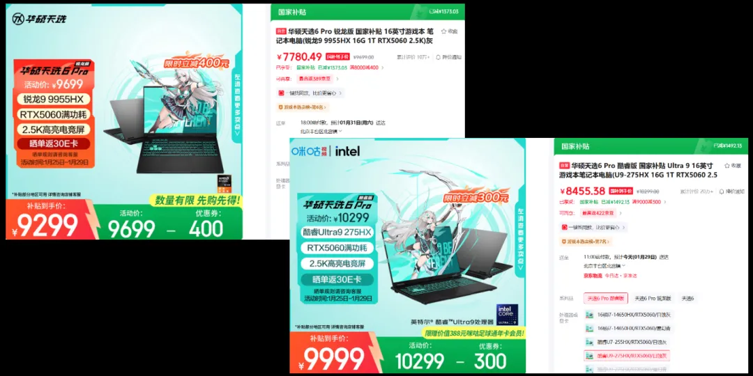 那就是以华硕天选为代表的游戏本,在成本上行的压力下,在年货节期间依旧给出了大额的减免优惠,很多热门型号在叠加15%的国补优惠后,实际到手价已经非常接近2025年20%国补后的历史最低价了。
