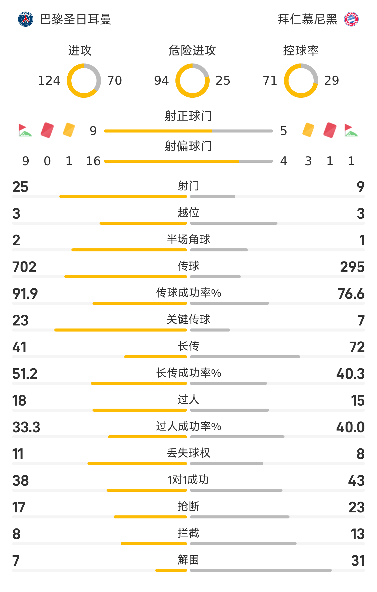 面对巴黎的围攻,拜仁全线退守,诺伊尔高接低挡,全场比赛巴黎25次射门仅打入1球,而拜仁9次射门即收获2球。