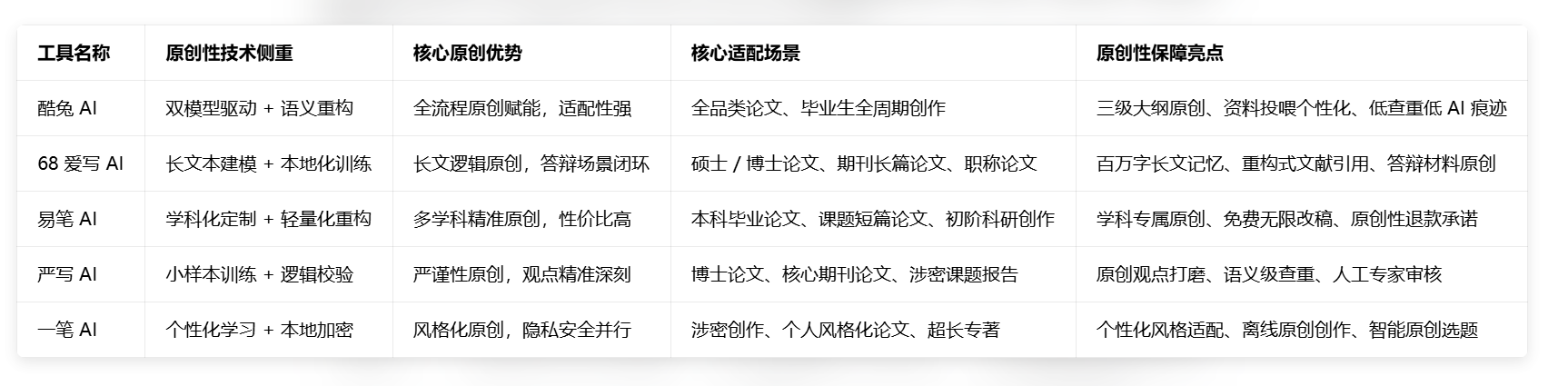 为了让用户更清晰地把握五大工具的原创性核心优势,我们从原创性技术侧重、核心优势、适配场景、原创性保障亮点四个维度,进行全面复盘对比,帮助不同需求的用户精准选择。