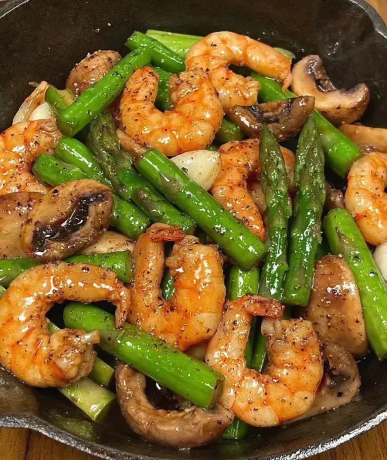 锅里留底油,下蒜末爆香,闻到蒜香冒出来的时候,把口蘑片倒进去翻炒,口蘑会慢慢变得软润,还会析出一点汁水。这时候把芦笋和虾仁一起倒回锅里,转大火快速翻匀,调味只需要三样:一勺生抽补味,一勺蚝油提鲜,再撒点黑胡椒碎增香。别加太多调料,这菜吃的就是食材本身的嫩甜,调料多了反而抢戏。翻炒10秒左右,看虾仁裹满油光、芦笋挂着酱汁,就能关火出锅了。