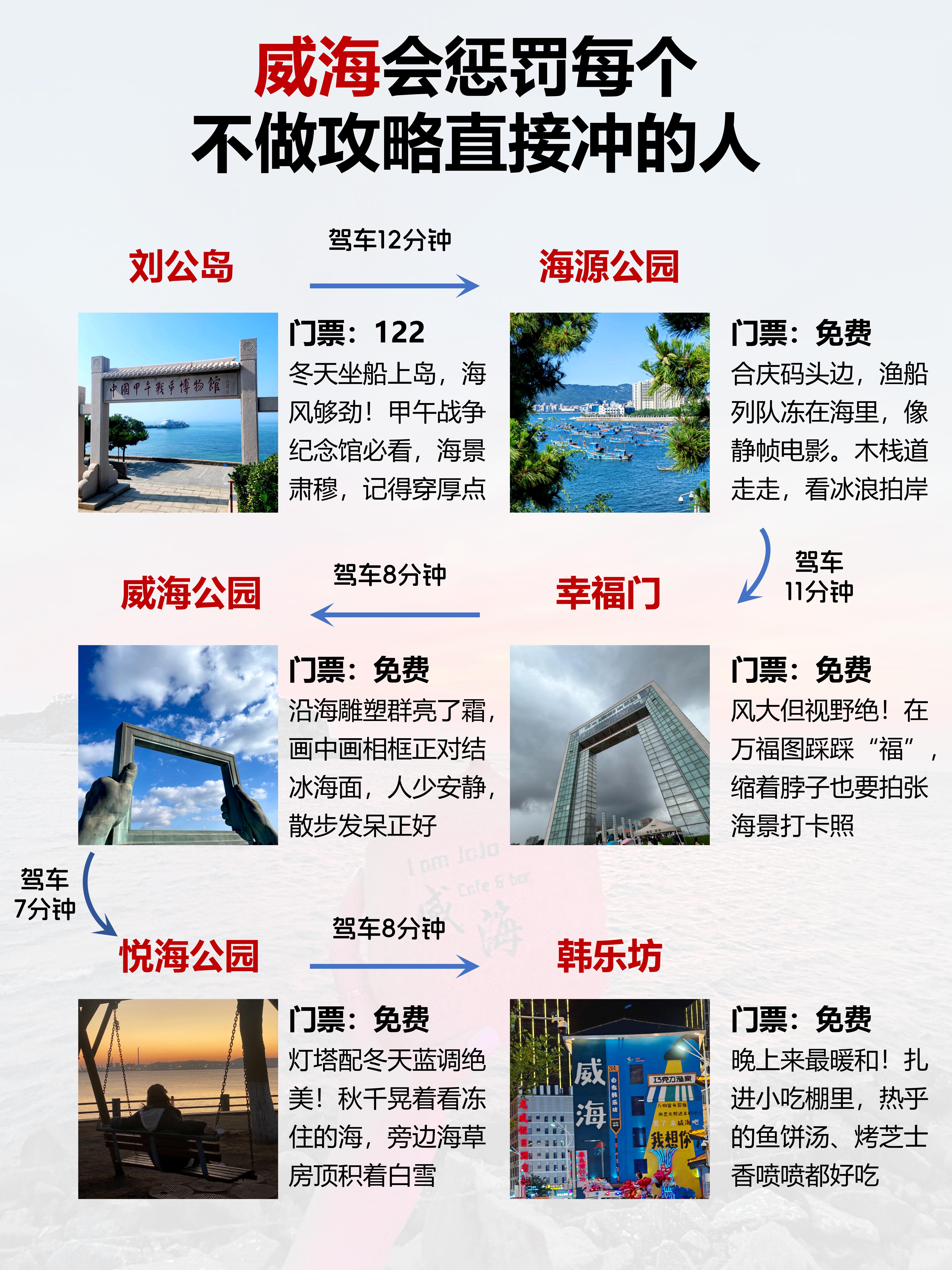 · 刘公岛:冬天船班少,务必提前查好时刻表。岛上人少安静,甲午战争纪念馆里能沉下心看看历史。天气晴好时,坐索道俯瞰山海