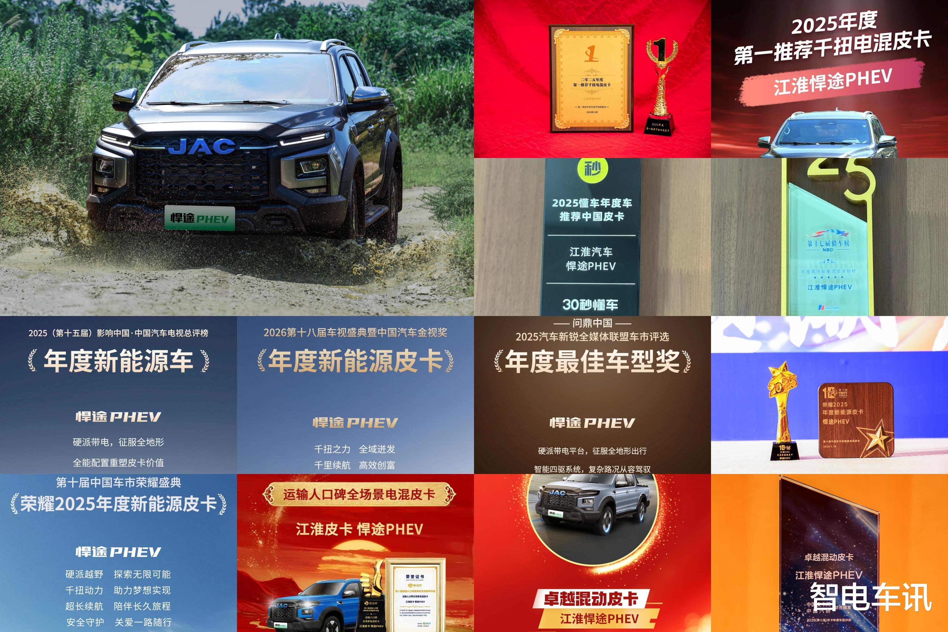 在收获全球用户信赖的同时,江淮皮卡的产品和技术再获权威评选认证。岁末年初,江淮悍途PHEV接连斩获权威媒体“年度第一推荐千扭电混皮卡”、“年度新能源车”、“年度新能源皮卡”、“年度最佳车型奖”、“全场景电混皮卡”等重磅奖项,成为响当当的年度电混皮卡。