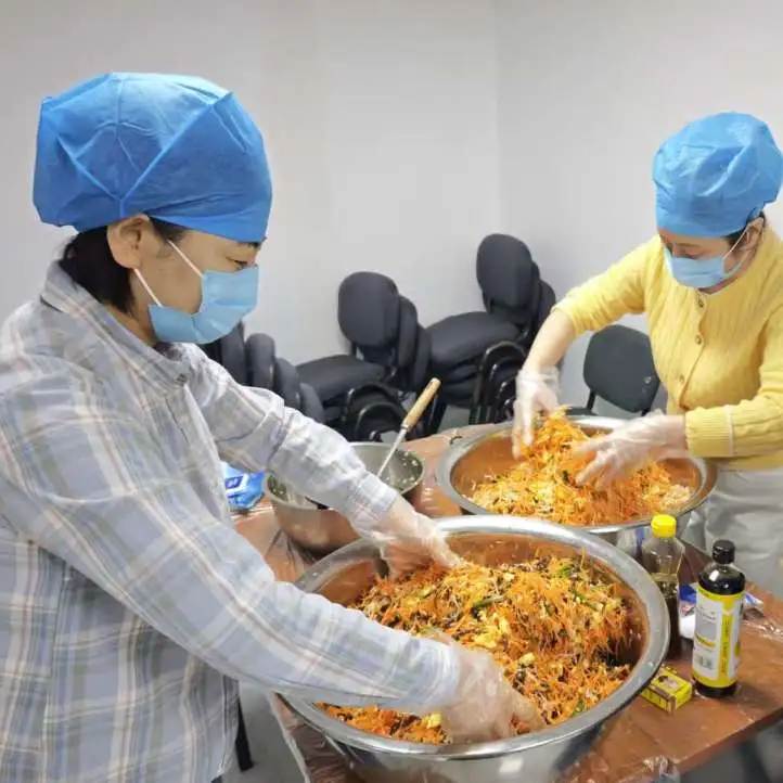 今天清晨,工作人员便在社区活动中心开始筹备。操作区里,翠绿欲滴的韭菜、金黄蓬松的炒蛋、脆嫩爽口的胡萝卜丝、清甜绵密的豆沙馅,各色食材鲜香十足;勺子、铁盆等工具被擦拭得锃亮,消毒湿巾与一次性手套整齐陈列,从细节处筑牢了食品安全防线。