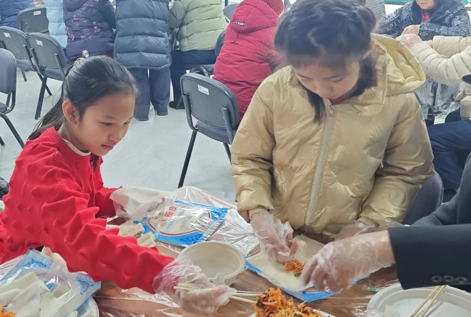 随着讲解结束,制作环节正式拉开序幕。大人小孩齐上阵,现场瞬间热闹起来。大人们做起春卷来驾轻就熟,一套动作行云流水,眨眼间,一只只形态规整的春卷便在掌心诞生;孩子们则小心翼翼地捧着春卷皮,舀馅时屏住呼吸、慢慢挪动,脸上满是认真的神情;邻里间更是默契十足,你帮我递一张春卷皮,我教你怎么卷得更紧实,温情在欢声笑语中静静流淌。