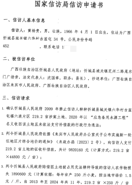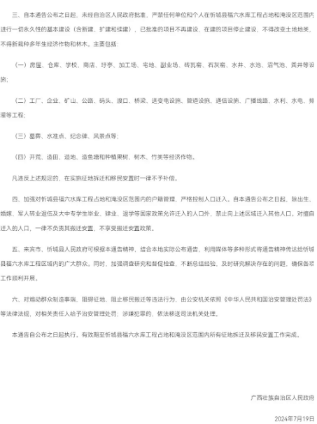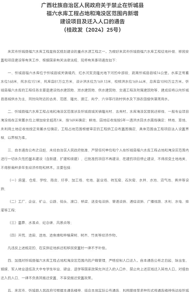 其三,否认征收行为却发布征收通告,自相矛盾。忻城县政务服务和大数据发展局曾在政府信息公开告知书中称,福六浪堵洞成库项目未占用土地,不涉及土地征收;但广西壮族自治区人民政府却于2024年发布了水库工程占地和淹没区的相关通告,明确了征地补偿、移民安置等工作要求。"一会儿说没有征收,一会儿又发布征收通告,政府的说法自相矛盾,根本站不住脚。"