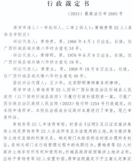 目前,古崖屯52户村民已向广西壮族自治区人民检察院提出检察监督申请,请求检察机关依法监督广西壮族自治区高级人民法院作出的相关裁定,纠正错误,维护其合法权益。同时,村民们也向国家信访局提交了信访申请,希望上级部门能够重视此事,督促忻城县人民政府履行补偿职责,支付土地补偿款和农作物损失赔偿,保障其长远生计。