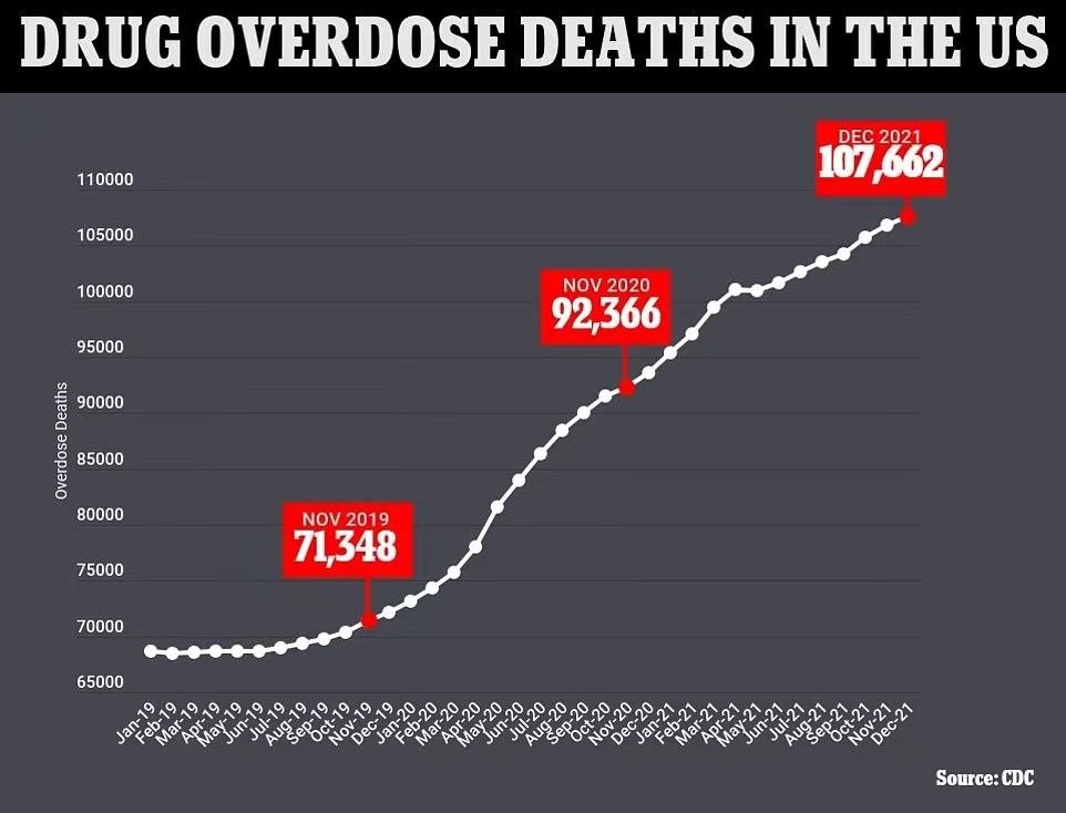 2019年美国有超过7万人死于用药过量,超过3.6万人死于过量服用合成阿片类药物。2020年,美国有9.3万人死于用药过量,其中超过60%的人与芬太尼有关。这超过了在越南、伊拉克和阿富汗战争中死亡的美国军事人员的总和。死亡人数每年都在急剧上升, 绝大多数来自芬太尼。2021年,美国毒贩化学家将甲苯噻嗪(Xylazine)掺入芬太尼,做成更为强效的“tranq”僵尸药。CDC的数据显示,2021年8月至2022年8月期间,美国有10.77万人死于药物中毒,其中66%的死亡涉及芬太尼等阿片类药物。