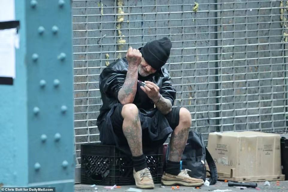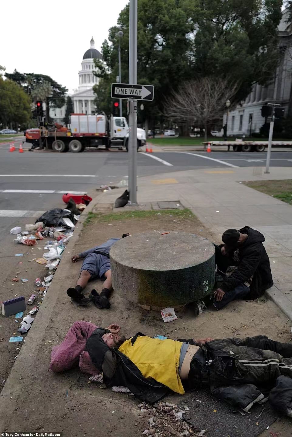 ▎在加州萨克拉门托国会大厦前躺着使用芬太尼的吸毒者。