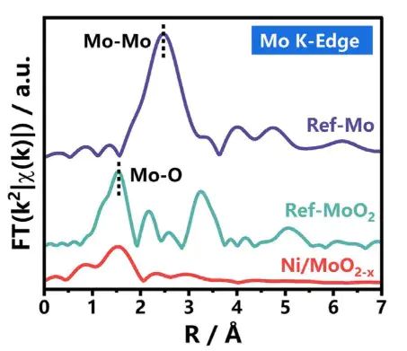 化学键的电子态v原子的配位数和键长v例如,研究人员在EXAFS光谱中观察到的1.5和2.5 Å处的峰分别对应于Mo-O和Mo-Mo键。在Ni/MoO催化剂上,Mo-O键强度的降低被归因于表面大量的O缺陷(图11),这一现象被用来解释其出色的氢电催化活性。
