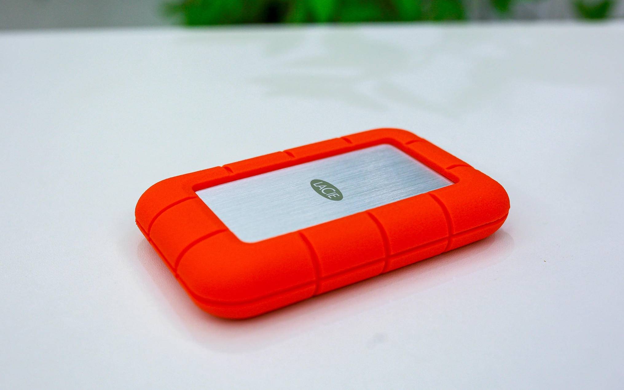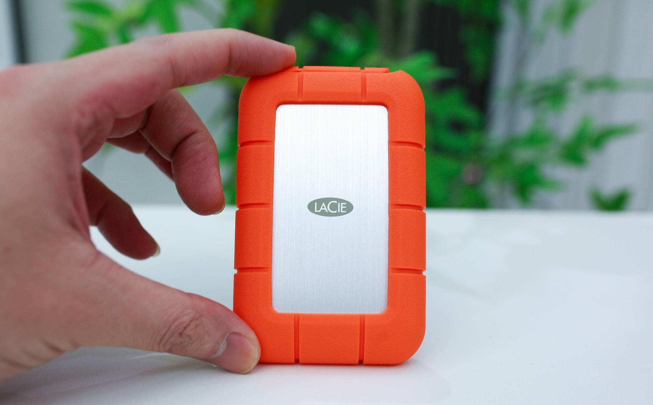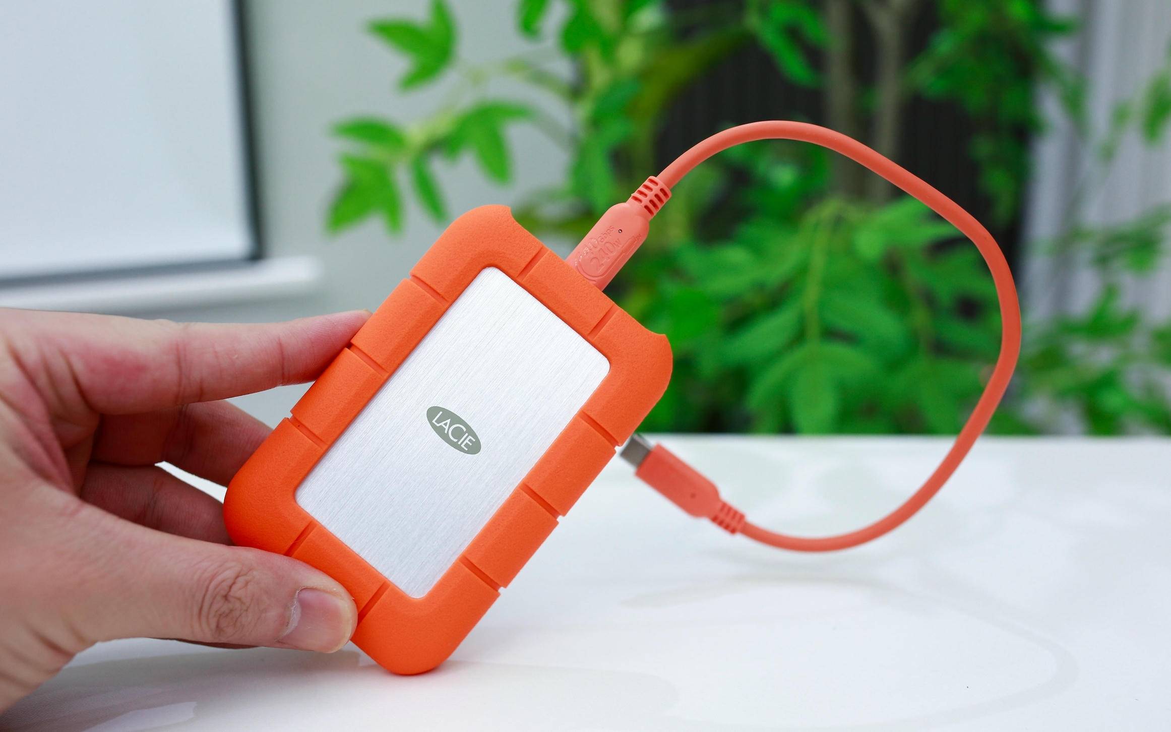 在体积和重量方面,LaCie Rugged SSD4 也明显优于传统移动机械硬盘。整机尺寸为 105mm × 67mm × 17mm,重量仅 108g,单手握持毫无压力。橡胶保护套表面摩擦力很强,拿在手里不容易滑脱,放进相机包或背包侧袋也几乎不占空间。对于需要频繁外出创作的人来说,这种“随手就能带走”的便携性非常重要。