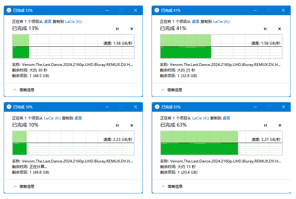 实际拷贝测试,通过复制粘贴 50GB 不可压缩伪随机文件,可以较真实地反映 LaCie Rugged SSD4 的持续读写能力。写入稳定在约1.58GB/s,全程未降速,说明其 SLC Cache 容量明显大于 50GB;读取稳定在约2.2GB/s,曲线平直,表现出较好的持续性能与控制能力。在 Windows 11 环境下,如果只依赖资源管理器进行复制粘贴,SSD 的性能往往会被系统的单线程与调度机制严重限制。
