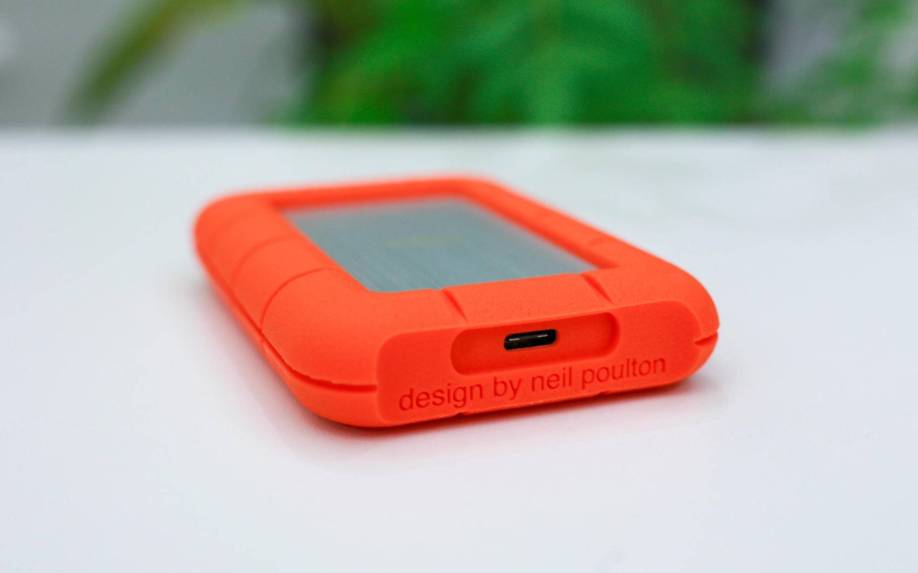外圈包裹着一整圈厚实又有韧性的橙色橡胶保护套,中间是银色拉丝金属盘体,视觉上非常醒目。细节上,Rugged SSD4 延续了Rugged系列一贯的实用主义设计。