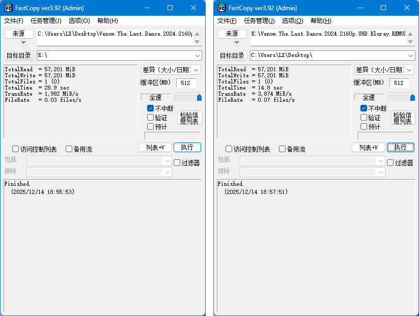 使用Fastcopy之类的专业软件,可以看到性能明显提升,在相同的 52GB 不可压缩测试文件下,LaCie Rugged SSD4 的写入速度直接提升至约 1982MB/s,读取速度甚至可达 3874MB/s,基本跑满 USB4 带宽。这说明前述“资源管理器测速偏低”并非硬盘瓶颈,而是 Windows 文件管理机制本身的限制。