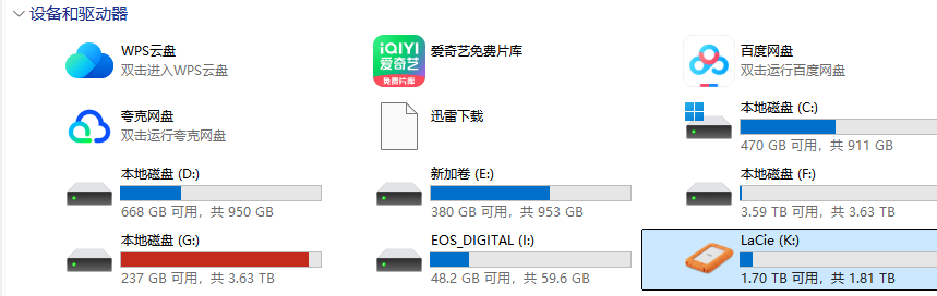 在容量和系统识别方面,2TB 版本在 Windows 下显示为约 1.81T,这属于正常的十进制与二进制换算差异,并非缩水。在 Windows 资源管理器中,这块硬盘的盘符图标依然保持了 LaCie 家族一贯的风格,辨识度很高。在多块外接硬盘同时使用的情况下,这种视觉上的区分反而挺实用。
