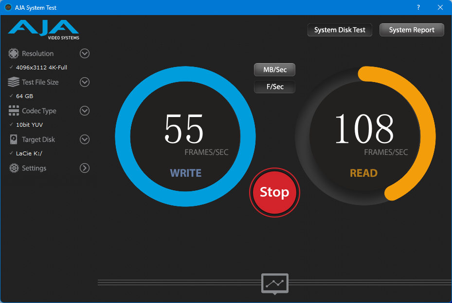 换算到帧率测试上,写入 55 帧每秒、读取 108 帧每秒的结果,意味着它在该编码和分辨率条件下,完全可以覆盖高码率 4K 视频素材的实时读写需求,甚至还有明显余量。这一点对于剪辑、调色、缓存盘使用非常关键,因为视频工作流更怕的是不稳定和突然卡顿,而不是少跑几百 MB/s 的理论速度。综合来看,这组 AJA 测试结果说明 Rugged SSD4 不只是“跑分好看”,而是在专业级连续负载场景下,确实具备可靠且可持续的性能输出。