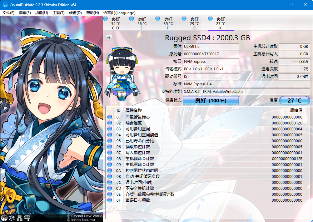 作为一块移动固态硬盘,性能始终是绕不开的话题。先用 CrystalDiskInfo 看一眼硬盘的 S.M.A.R.T 信息。LaCie Rugged SSD4 在这一点上表现得非常干净,各项关键指标都显示为零读零写,确认是全新盘状态。同时可以看到它支持 NVMe 1.4 协议,这也从侧面说明它并不是简单的“移动外壳加普通固态”,而是标准较新的 NVMe 方案,对性能和稳定性都有基础保障。