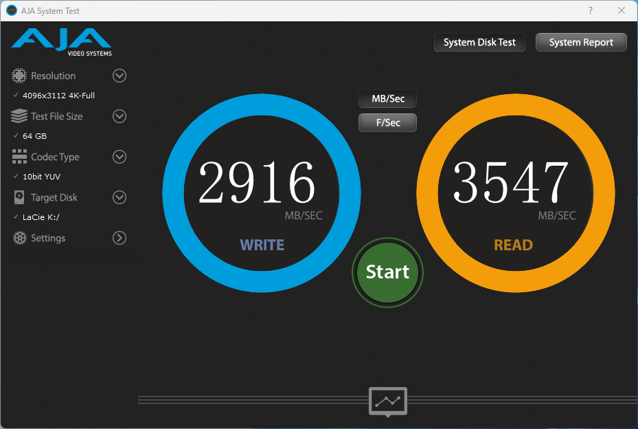 用AJA System Test模拟真实视频制作场景,对磁盘进行持续顺序读写,重点考察的是稳定吞吐能力,分辨率为 4096×3112 的 4K Full,10bit YUV 编码,单文件 64GB,这本身就是一个非常“硬核”的负载条件。在这种情况下,写入速度约 2916MB/s,读取速度约 3547MB/s,说明 LaCie Rugged SSD4 在长时间、大文件连续读写时,并没有明显掉速或触发限速机制。相比 CrystalDiskMark 的峰值成绩,这里数值略低是完全正常的,反而说明性能释放更贴近真实工作负载。