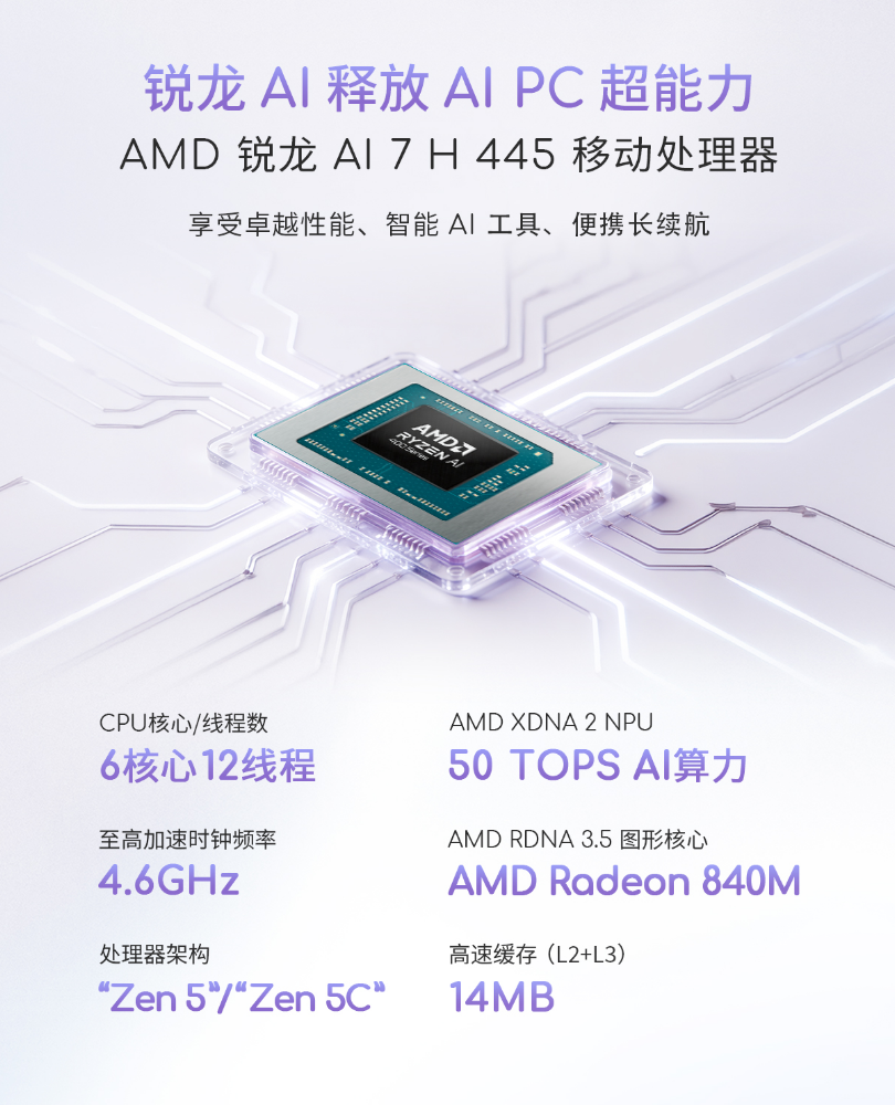 华硕a豆14 Air 2026配备全新AMD锐龙AI 7 H 445移动处理器,采用AMD "Zen 5"/"Zen 5c"架构,6核心12线程设计,最高主频可达4.6GHz,配合32GB LPDDR5X超高频内存,轻松驾驭多任务并行、内容创作、休闲娱乐等高强度用机场景。此外,该处理器还内置AMD Radeon 840M核显、AMD XDNA 2 NPU,提供卓越的图形处理性能,并以至高50 TOPS AI算力,大幅提升本地AI任务效率,提供前所未有的AIGC高能创作体验。在华硕冰锋散热系统的加持下,内吹风道设计搭配双风扇双热管,性能释放提升28%、散热面积增加2.3倍,大幅提升散热效率,确保45W强劲性能持续稳定释放。