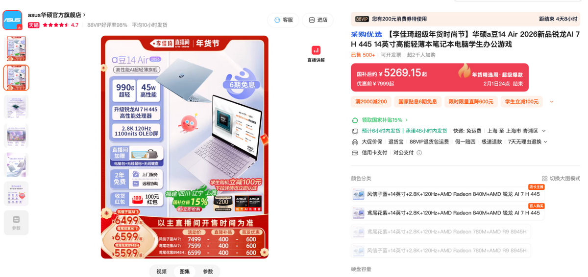 当前购机,不仅可免费加入a豆无忧服务计划(2年硬件上门服务、2年无限远程协助、2年好屏无忧换新、2年整机保修服务),还提供100元收货红包,直播间购买额外加赠电脑包、无线鼠标、无线键盘等外设周边福利。感兴趣的用户可点击下方链接或者上京东商城搜索#华硕a豆14 Air 2026#,获取更多产品细节。