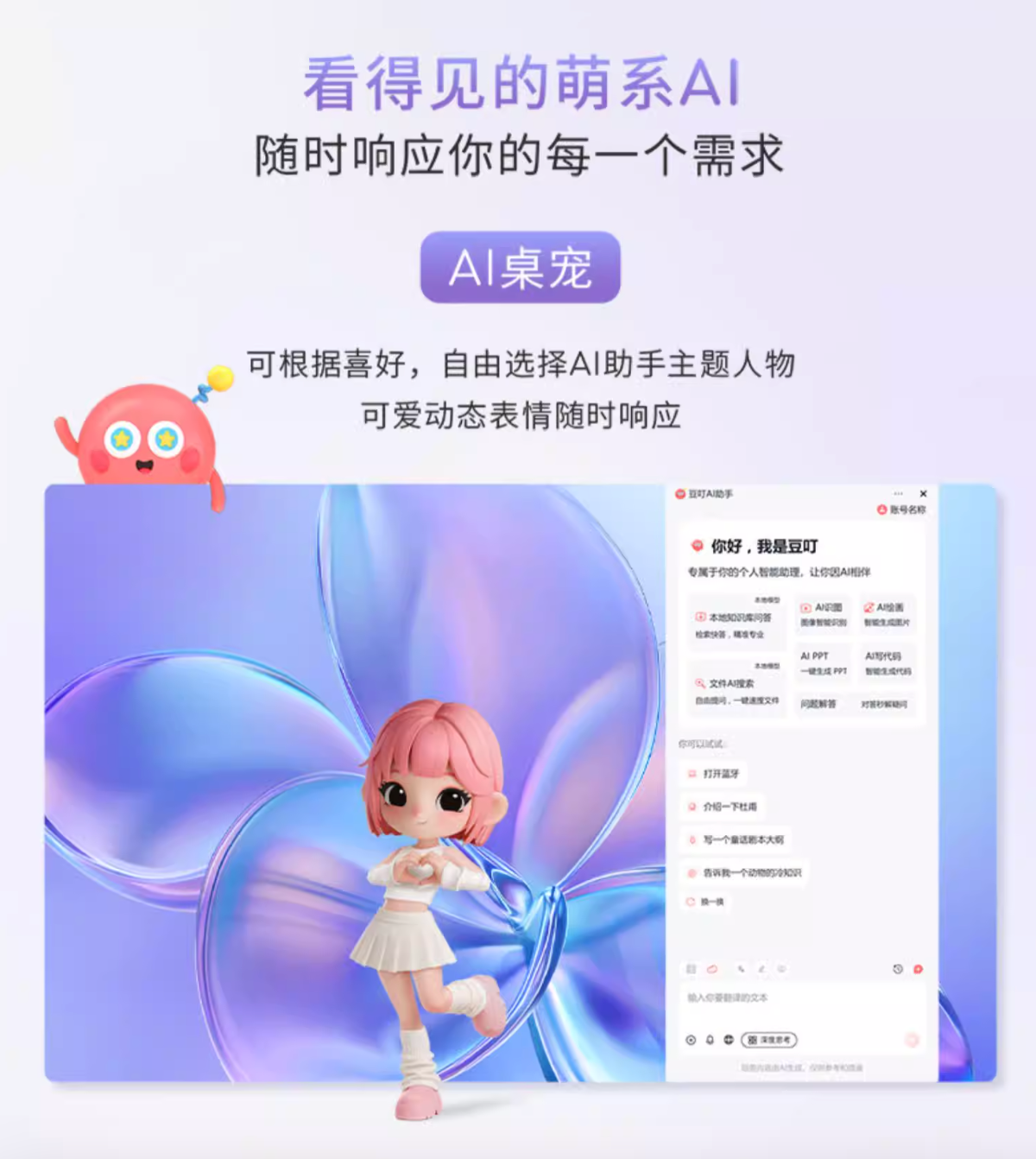 为让AI体验深度覆盖全用机场景,内置的豆叮AI助手,基于端云一体AI大模型,提供AI PPT、AI绘图、AI写代码、AI文件搜索、全能写作等功能,助力高效辅助方案撰写、内容创作等日常办公、创作流程,并支持断网可用,随时随地高能在线,助力一键智控全局。此外,它还升级全新AI桌宠功能,新增Q版AI朵皮肤,并支持根据个人喜好自由选择AI助手主题人物,可爱的动态表情随时响应,为高强度办公与创作增添治愈感,提供超越工具属性的情绪价值。