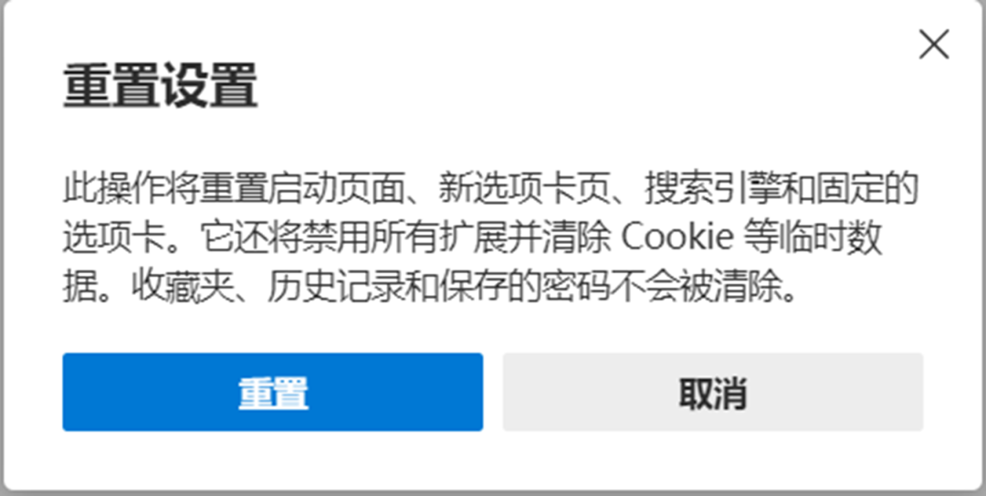以Microsoft Edge为例,点击右上角的 [...] 设置图标,然后依次点选[设置---重置设置---将设置还原为其默认值---重置]。