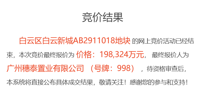 刚刚,竞价31轮,广州穗泰置业有限公司(保利发展)以总价约19.8亿拿下白云区白云新城AB2911018地块,折合成交楼面价约3.8万/平(未扣除配建)。保利连续高溢价拿下白云、海珠(南泰路地块)两大宅地,显著拉高了市场预期,有望提振市场,对明年楼市加速回暖充满信心。