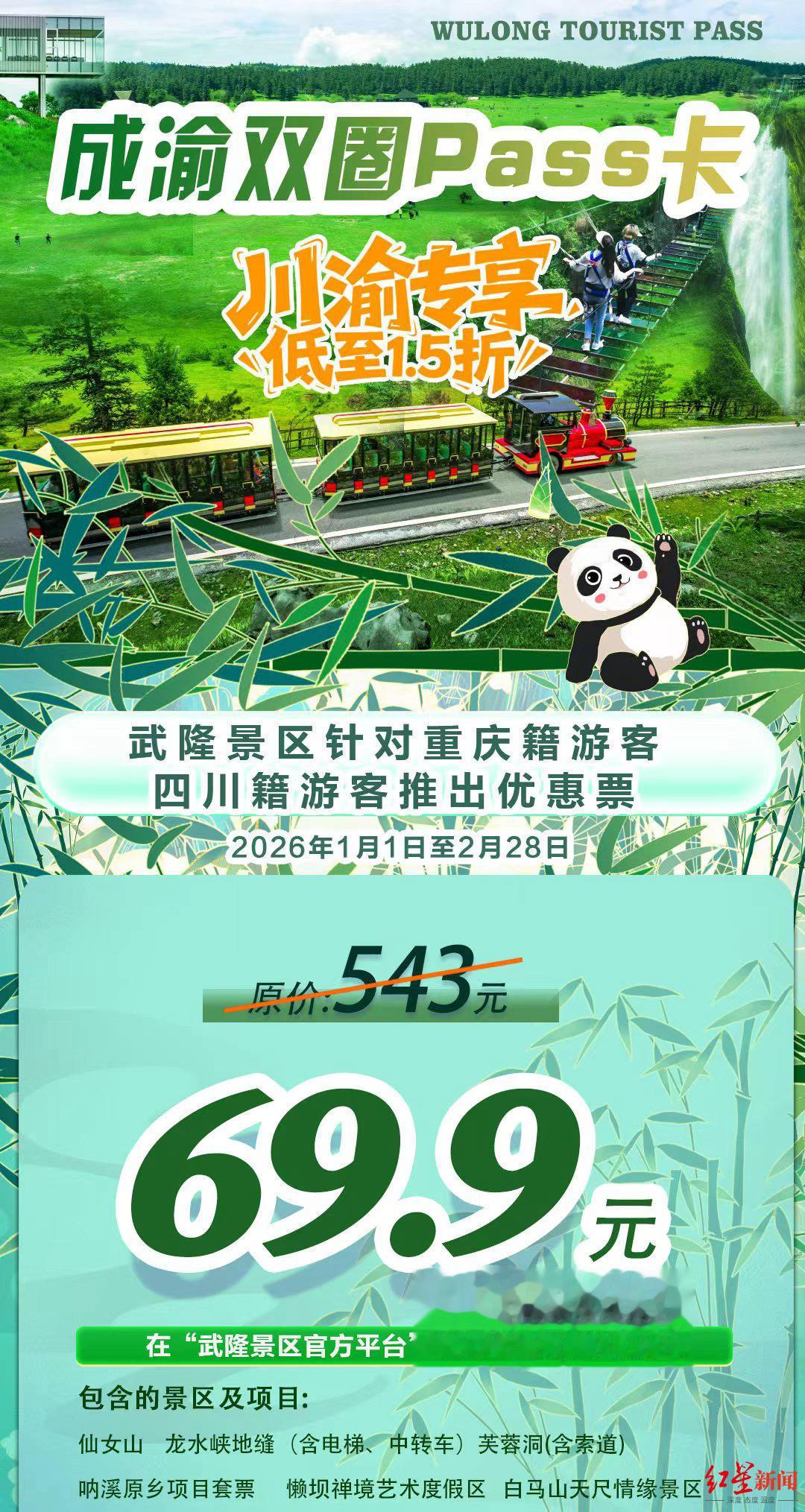 即日起至2月28日,武隆景区面向重庆籍、四川籍游客特别推出“成渝双圈Pass卡”:原价543元的仙女山、芙蓉洞(含索道)、龙水峡地缝(含电梯、中转车)、白马山天尺情缘景区、懒坝禅境艺术度假区、呐溪原乡六大景区及项目套票,现仅需69.9元。