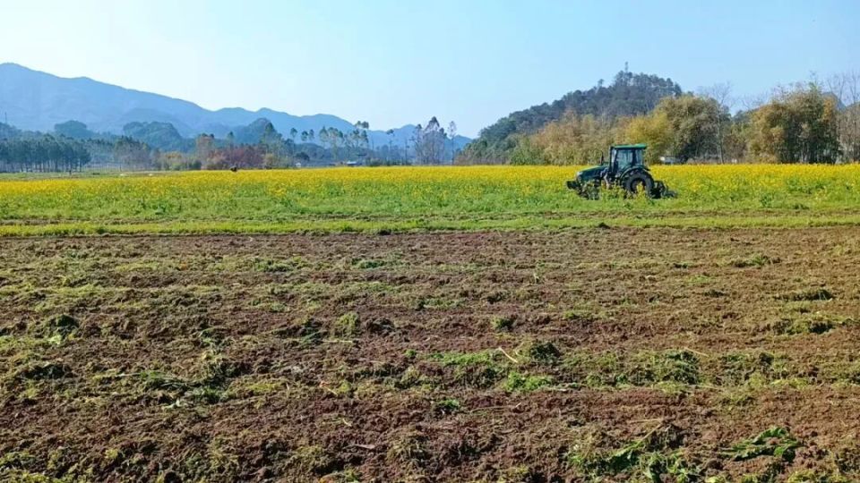 在黄岗片区的白莲、新洲、井塘、五星等村,太和镇共种植紫云英2000亩,并在五星村连片打造1000亩油菜花海。随着春耕推进,农户抢抓晴好天气进行翻压作业,农机在田间往来穿梭,将越冬绿肥覆入泥土。