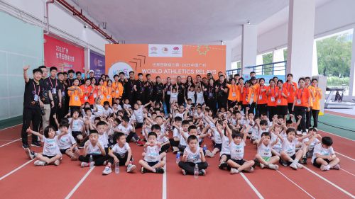 世界田联主席塞巴斯蒂安·科、广州市体育局副局长贾俊峰、中国运动员苏炳添、梁小静、世界顶级田径明星们与参赛孩子们合影留念