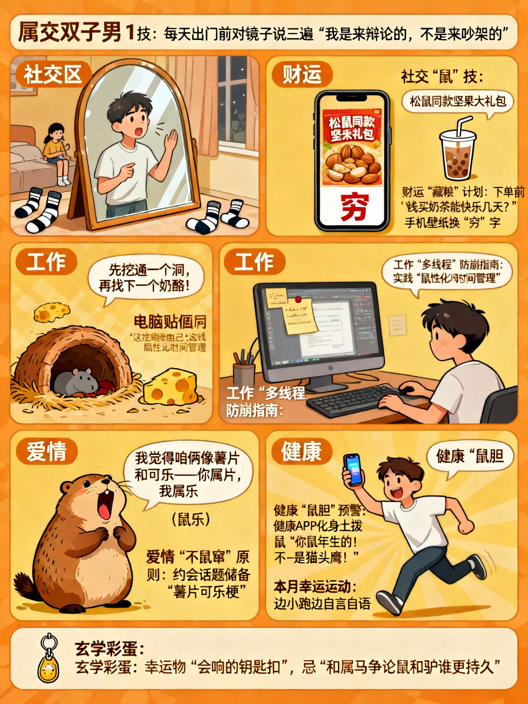 3. 工作“多线程”防崩指南双子脑洞像鼠窝,点子乱窜但容易忘正事。每天用便签贴电脑:“先挖通一个洞,再找下一个奶酪!”——老板若问,就说在实践“鼠性化时间管理”。