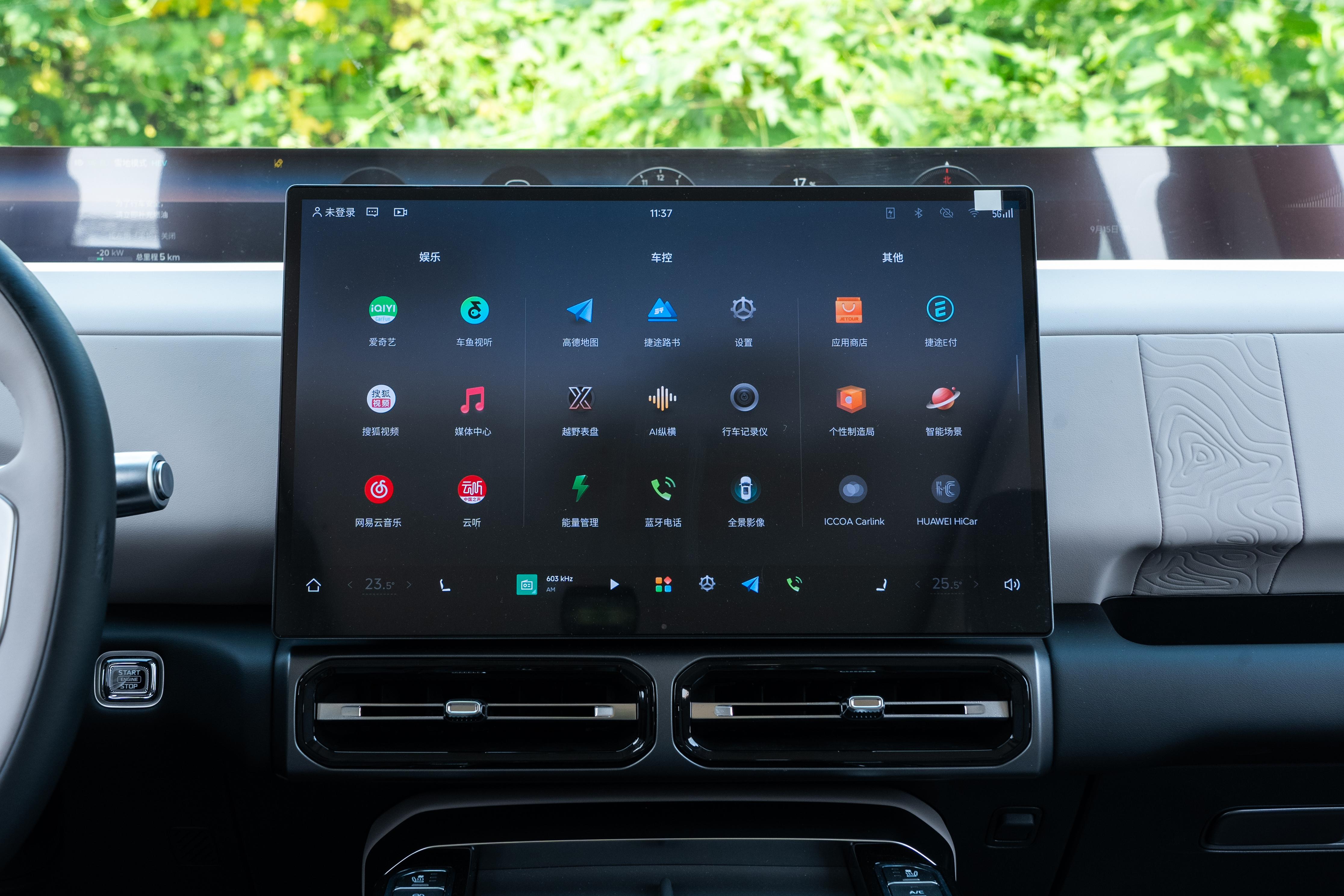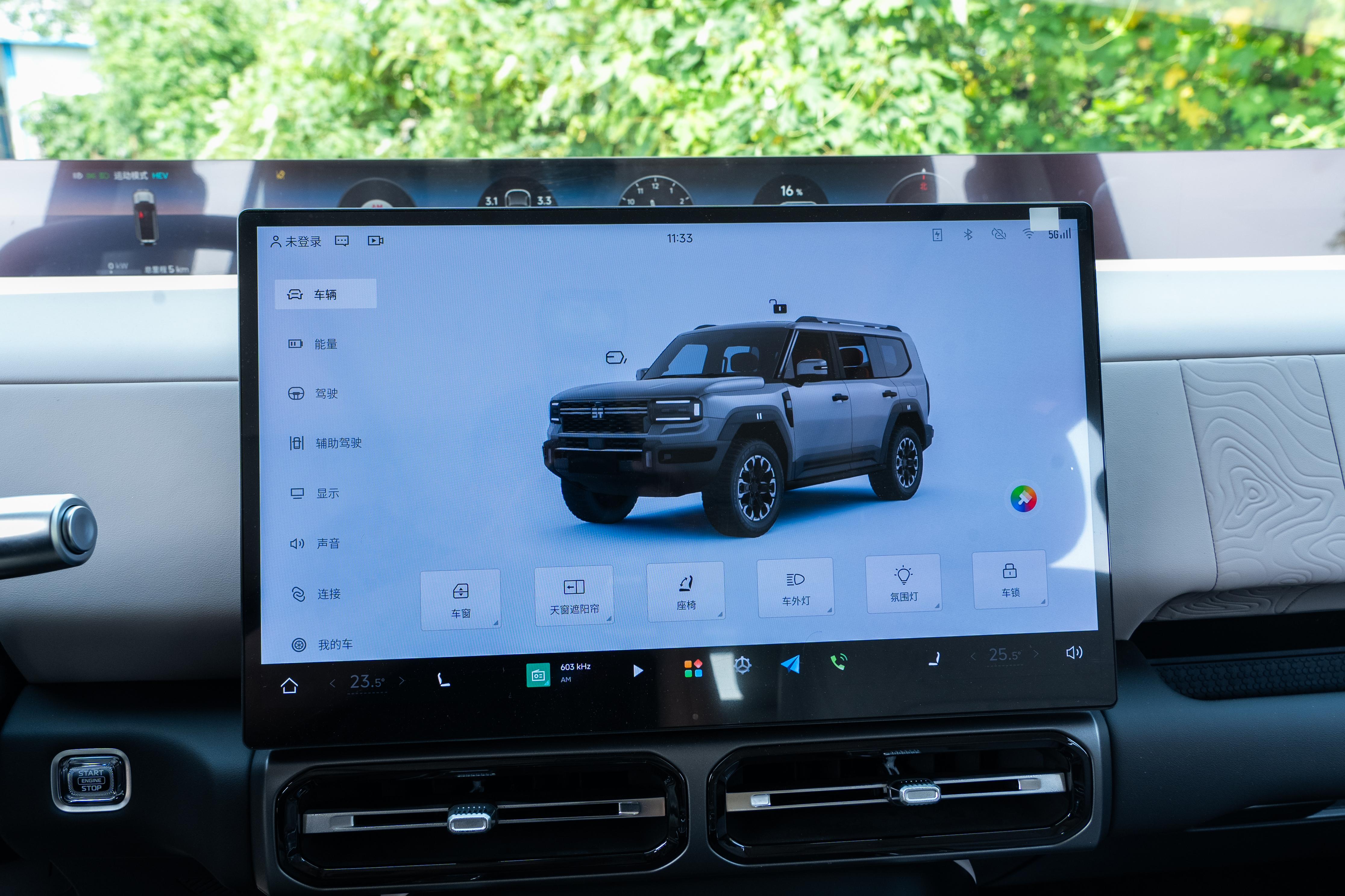 拉开车门,纵横G700的内饰直接打破了小编对硬派越野固有的那份成见,之前总认为硬派越野车,更注重越野性能,在精致和智慧上会差点儿意思,没想到咱这车却精致又好用。15.6英寸的2.5K分辨率中控大屏,画面清清楚楚的,点起来丝滑不卡顿。车机搭载纵横OS车载系统,支持5G网络,OTA升级,不光用着顺,还常用常新不落伍。语音交互也主打一个省心。支持免唤醒和分区域识别,咱就喊一句“你好纵横”,就可以动口不动手,调空调温度,切换歌曲,座椅功能,张个嘴就完成了,小编素来是个怕麻烦的,这个功能可正称了心了。还有那个可见即可说功能,屏幕上看到的功能,就只要对着屏幕说就成,老妈素来看听戏,试驾时打开屏幕,音乐界面就出现了锡剧选段《双推磨》,老妈也试着来了句,播放《双推磨》,吴侬软语在车厢里响起来,老妈乐得直点头,这个好,我都学的会,真简单。科技化配置让我们更切切实实地感受到了“智”的魅力。