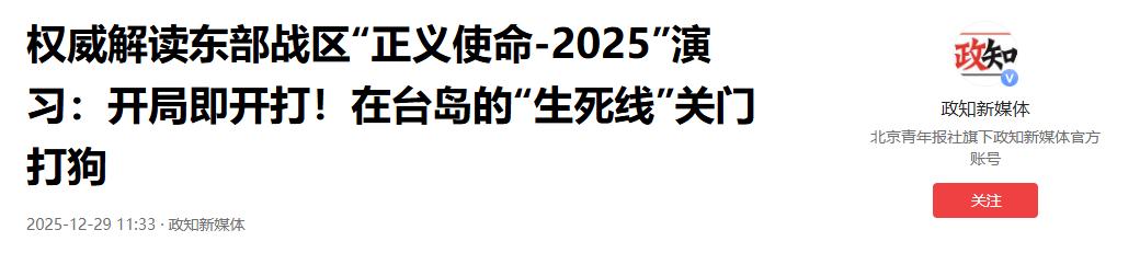 军演的四大科目更是直指 “台独” 要害:海空战备警巡让台岛周边的海空控制权牢牢掌握在解放军手里,任何异动都逃不过监控;夺取综合制权不光是制空制海,还包括制信息权、制电磁权,相当于让 “台独” 势力变成 “瞎子聋子”;要港要域封控直接掐住了高雄港这些台湾的经济和军事命脉,断了物资流通的关键通道;外线立体慑阻则明明白白针对外部干涉势力,台岛以东的演习区直接阻断了所谓的 “能源进口线”“逃跑线” 和 “外部支援线”,让 “台独” 势力幻想的 “外部救援” 彻底沦为泡影。12 月 30 日,解放军还在相关海域开展了对海实弹射击,用真枪实弹证明,捍卫国家主权和领土完整的决心绝不是说说而已。