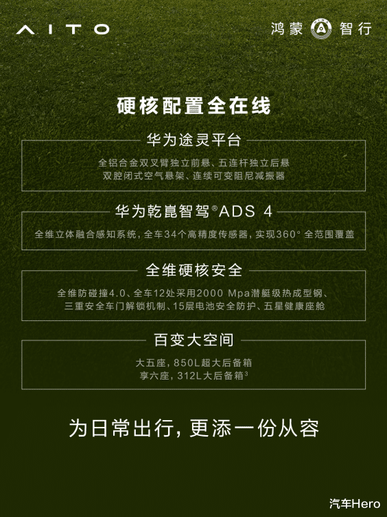 值得关注的是,全新问界M7增程长续航版悉数保留了在售车型的核心配置,硬核配置全面在线。华为途灵平台搭载全铝合金双叉臂独立前悬、五连杆独立后悬、双腔闭式空气悬架、连续可变阻尼减振器,兼顾舒适性与驾控质感;华为乾崑智驾ADS 4辅助驾驶系统配合34个感知硬件,可实现对动静态目标(含异形物体)的全场景和全天候感知,提升雨雾尘恶劣天气的安全性,以及对后向悬浮物、负向场景的识别,实现360度全覆盖;全维防碰撞4.0显著提升行车安全,全天候守护用户驾乘全程。